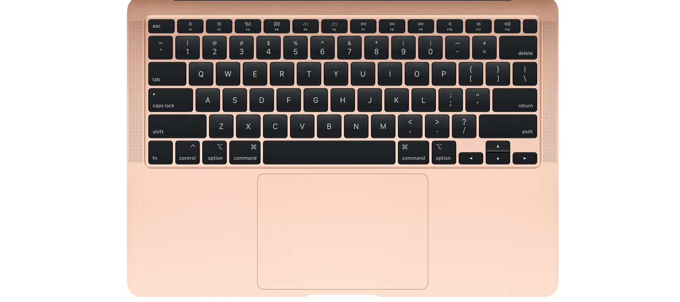 MacBook Air now features the new Magic Keyboard, first seen on the 16-inch MacBook Pro. The refined scissor mechanism with 1 mm of travel delivers a responsive, comfortable, and quiet typing experience. The inverted-T arrow keys help you fly through lines of code, spreadsheets, or game environments. And the backlit keys with ambient light sensor help you type in low-light settings.